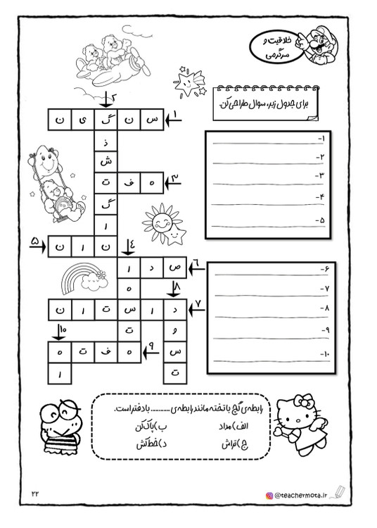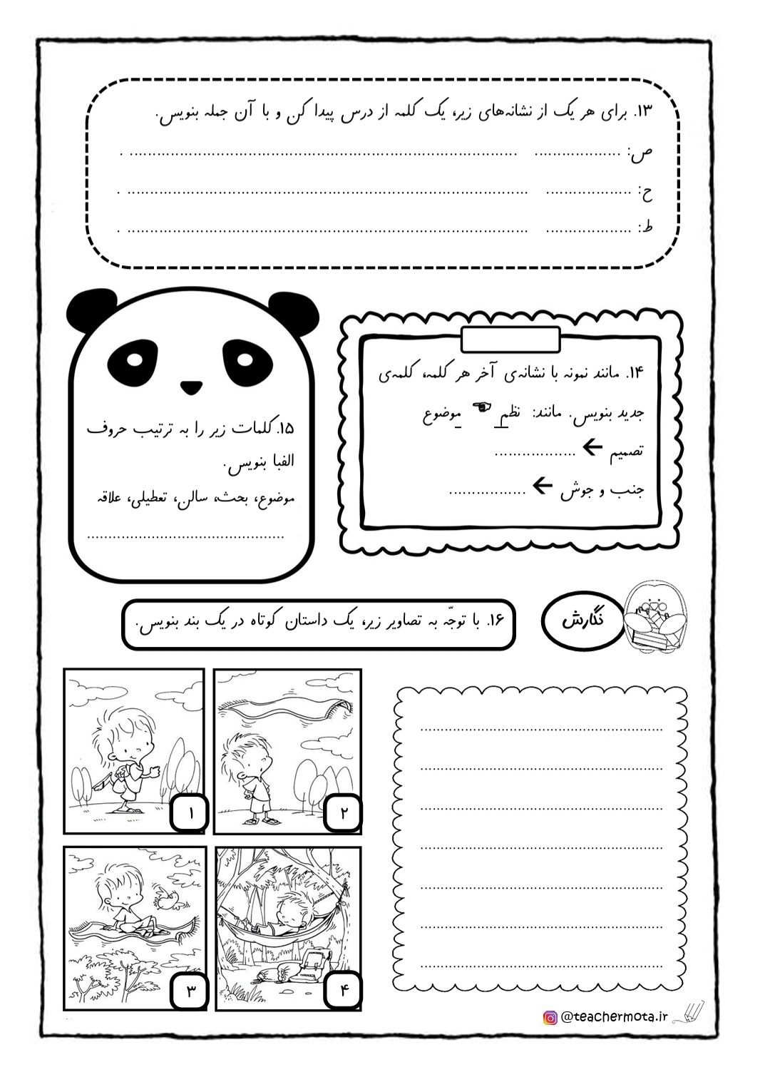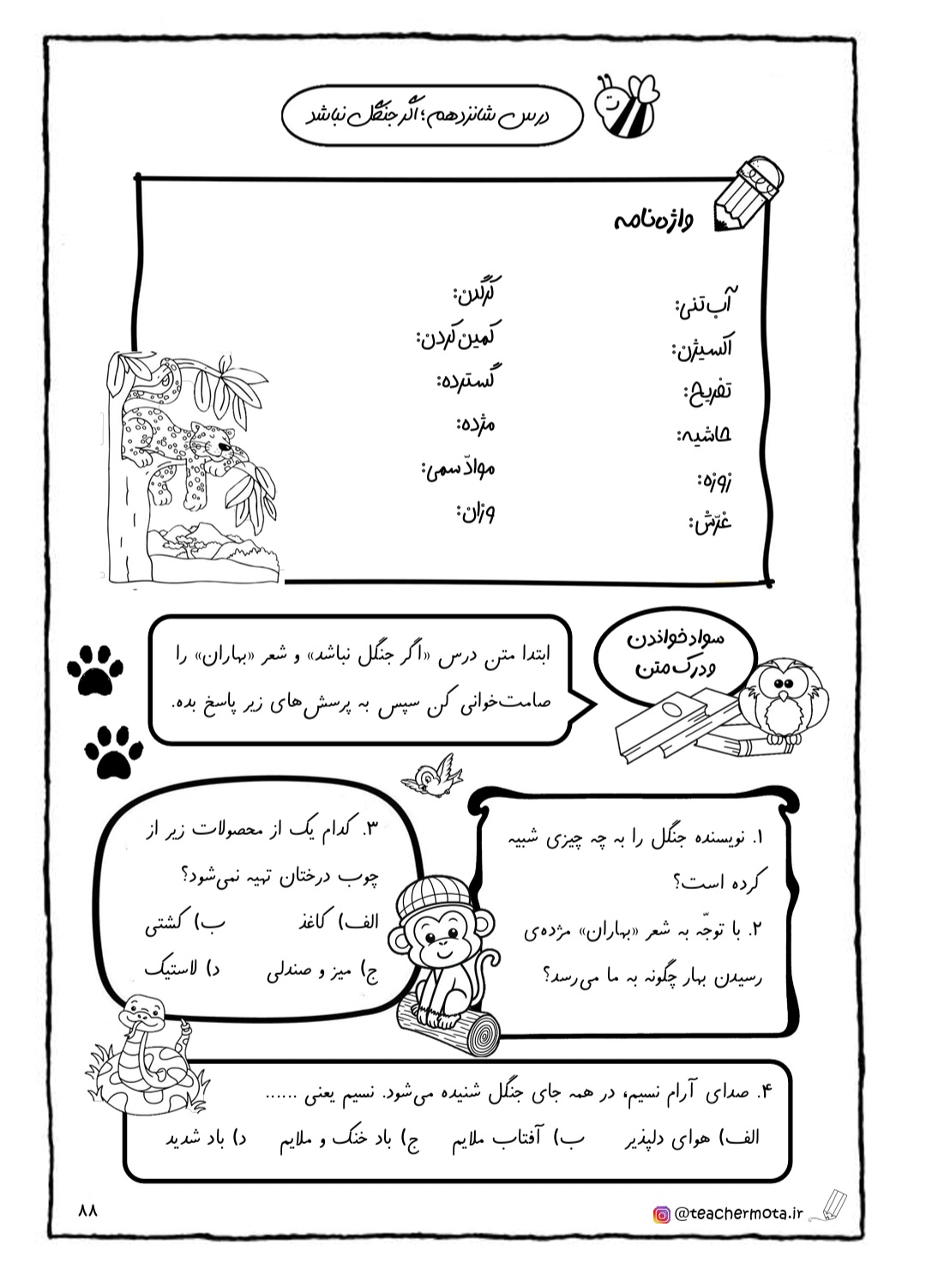 «واژه آموزی» ، «دانش زبانی» ، «دیکته» و «نگارش» پرسش های دیگر هر درس است. در انتهای هر درس فعالیت های هدفمندی با عنوان «خلاقیت و سرگرمی» در نظر گرفته شده است.