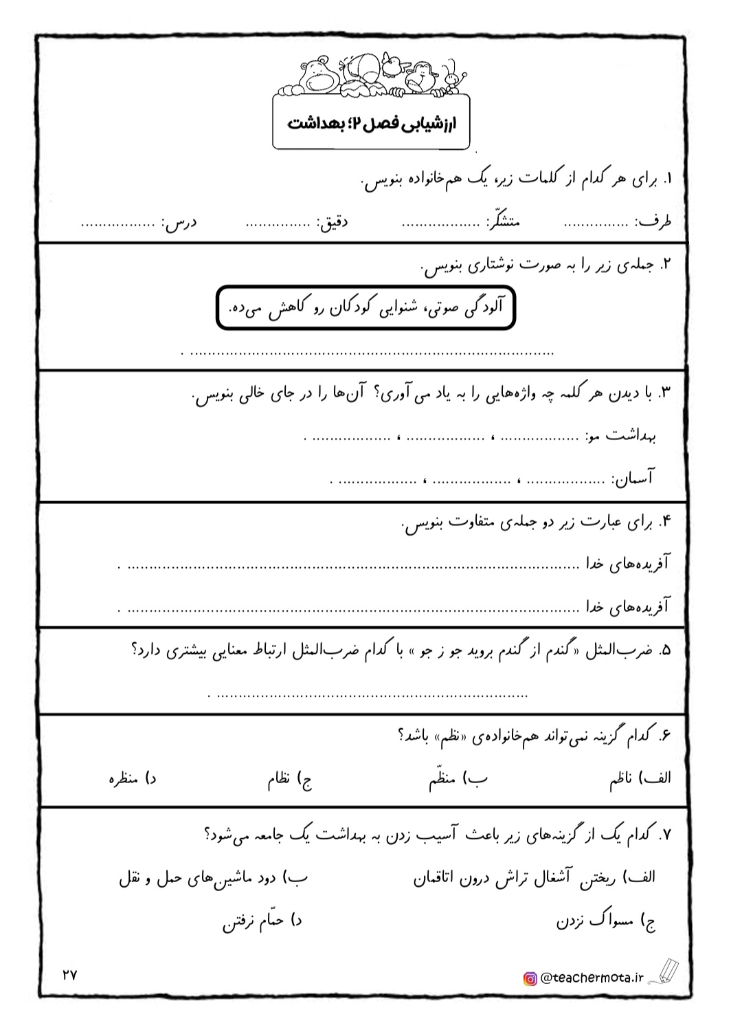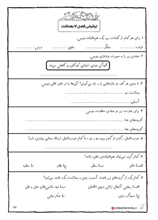 در پایان هر فصل مجموعه سوالاتی با عنوان « ارزشیابی فصل» جهت تکرار و تمرین و تثبیت یادگیری دانش آموز عزیز قرار داده شده است.