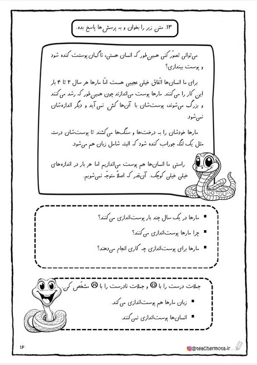 در قسمت «سواد خواندن و درک متن» پرسش هایی متفاوت با متن کتاب درسی برای هر درس در نظر گرفته شده است که شامل پرسشهای پاسخ کوتاه، چهارگزینه ای و درست و نادرست است.